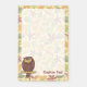 Cartoon-Abbildung der Eule, die auf einem Zweig über Blätter sitzt, beige nahtlos Hintergrund. Eigener Text.