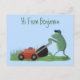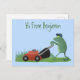 Ein lustiger grüner Frosch, der den Rasen im albernen Cartoon-Stil mäht.