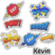 Cartoon-Aufkleber mit Klangeffektblasen im Action-Held-Stil. Personalisieren Sie den benutzerdefinierten schwarzen Text auf dem unteren Aufkleber, um zu lesen, was Sie gewollt haben.