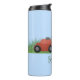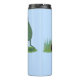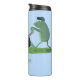 Ein lustiger grüner Frosch, der den Rasen im albernen Cartoon-Stil mäht.