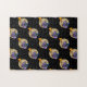 Cartoon Zauberer Eu fliegen auf einem magischen Besen in einem Vollmond Nachtmuster. Die violette Eule trägt einen Zauberhut und eine große rote runde Brille und wirkt mit einem Zauberstab. Ideal für Halloween- oder Zauberer, Hexen und Magie-Liebhaber.