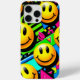 Diese Handyhülle verfügt über ein unterhaltsames, spielerisches Design mit hellen, fröhlichen Smiley-Gesichtern und einer Ästhetik der 90er Jahre. Sie ist als schützende, ultradünne und leichte Hülle aus hartem Polycarbonat oder thermoplastischem Polyurethan-Material konzipiert und bietet häufig militärischen Stoßschutz und Kompatibilität mit MagSafe-Drahtlosladen.