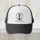 Casquette noir moderne sur le thème nautique avec une illustration d'une ancre dans un cercle et le nom de votre bateau dans une simple typographie.