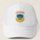 Le drapeau national et les armoiries de l'Ukraine sont infusées dans une fausse forme de bouclier doré qui, à son tour, repose sur deux faux bras feuille de laurier.