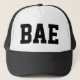Casquette de camionneur avec le dos de maille. Texte imprimé ; "BAE" sur l'avant. Perfectionnez pour des couples.