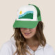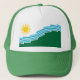 Casquette avec un design avec le drapeau de Spokane, Washington. Un drapeau blanc et vert aux lignes bleues symbolisant la rivière Spokane et les chutes Spokane et un soleil jaune