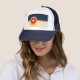 Trucker Hat avec un design avec le drapeau de Tulsa, Oklahoma. Un drapeau beige et bleu marine avec un bouclier or Osage contenant un cercle rouge et une étoile beige à six branches