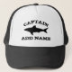 Casquette nommé fait sur commande de capitaine de bateau avec le logo de requin. Modèle vintage de typographie pour le marin, le pêcheur ou le capitaine. Faites votre propre casquette personnalisé pour la pêche, la navigation ou le canotage. Symbole noir et blanc avec le texte sale. Anniversaire masculin frais ou idée nautique de cadeau de fête des pères pour les hommes. Faites vos propres pour le papa, l'oncle, le père, le frère, le mari, le headwear fait sur commande du grand-papa etc. pour l'été. Silhouette d'animal d'océan.