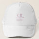 Montrez votre style personnel sur le parcours avec cette casquette de camionneur minimaliste rose et blanche à monogramme féminin. Avec deux initiales et un prénom et un nom séparés par une barre décorative, ce design épuré associe une typographie rose élégante à un fond blanc croustillant pour un look frais et moderne.