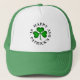 Un chapeau de camionneur avec un design de trèfle shamrock vert et un noir "HAPPY ST. PATRICK'S DAY" texte autour.