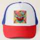 C'est un Casquette de maman de basket. Le design comprend un basket-ball avec maman de basket-ball en texte blanc et formes géométriques. C'est un chapeau de camionneur rouge, blanc et bleu.