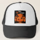 The image displays a black and white trucker hat featuring a vibrant graphic on its front panel. The graphic depicts a retro-style sunset scene with silhouetted palm trees against an orange and black sky, and the words "Wave Length" prominently displayed.