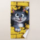 A dynamic and playful illustration depicting a gray-and-white tabby cat with large, wide eyes emerging from a hole in a bright yellow wall. The cat holds up a paw, from the end of which dangles a small white mouse suspended by a thin thread or tail. The scene has a humorous, fairytale feel, emphasized by the cat's expressive facial expression and the vibrant colors of the brick wall. The contrast between the dark interior of the hole and the light wall adds depth to the image and draws the eye to the central figures.