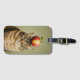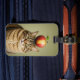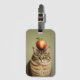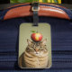 Eine lustige Katze mit einem Apfel, der auf seinem Kopf ausbalanciert.