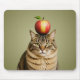 Eine lustige Katze mit einem Apfel, der auf seinem Kopf ausbalanciert.
