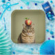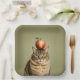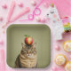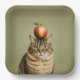 Eine lustige Katze mit einem Apfel, der auf seinem Kopf ausbalanciert.