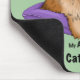 Eine orangefarbene Perserkatze auf einem königlich lila Kissen zeigt ihre Einstellung in grüner Umgebung