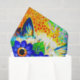 Tissue mit Louis Wains Tiermalerei Cat Blume Eyes (1860-1939). Eine Regenbogenkatze grindet weithin. Blaue Blumen bedecken seine Augen. Ein wunderbares Geschenk für Katzenliebhaber und englische Kunst.