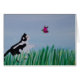 Ein bezauberndes Bild einer schwarz-weißen Katze, die einen schwarz-rosa Schmetterling an einem wolkenlosen Tag auf einer Karte durch ein Feld jagt. Dieses Bild wurde in den Computer gescannt.