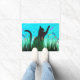 A black cat silhouette with dragonflies and cattail plants on a blue & green background.