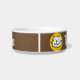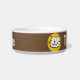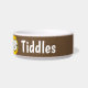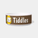 Fügen Sie dem lustigen Schüssel den Namen Ihres Haustieres hinzu, der eine Cartoon-Style-Abbildung eines Lächelns einer Katze enthält. Brauner Hintergrund.