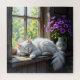 Cat Napping on the Window Sill | Purple Flowers