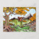 Hier ist eine Cartoon-Szene einer Orangenkatze, die auf dem Rücken eines Entenschnabel-Dinosauriers durch einen Herbstwald reitet. Natürlich ist das historisch nicht genau richtig, aber wer wollte nicht, mit einem Dinosaurier herumzufahren?
