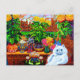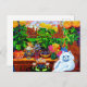 Postkarte mit Louis Wains Tiermalerei Master of Cat Uni (1860-1939). Eine wohlüberlegte, weiße Katze mit auffallend blauen Augen liegt wunderbar neben einer lebhaften Auswahl an wunderschönen Blume. Die majestätische Uni der Katze liegt im Hintergrund unter einem rosa und blauen Himmel. Ein wunderbares Geschenk für Katzenliebhaber und englische Kunst.