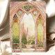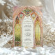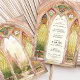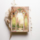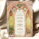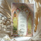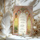 Cette superbe faire-part de mariage d'inspiration vitrail évoque la grandeur des cathédrales gothiques avec ses arches complexes et ses éclatantes couleurs. Le design présente des verdure, des dorures et des roses lumineux aux délicats accents floraux et ornementaux. Les fenêtres majestueuses encadrent un paysage de campagne serein, donnant un ton romantique et intemporel. Le dos vient compléter le design avec un motif cohésif en vitrail, parfait pour les mariages d'église ou de cathédrale, ou les couples à la recherche d'une touche artistique unique. Cette invitation capte l'essence de l'élégance et de la spiritualité, créant un souvenir chéri pour votre journée spéciale.