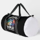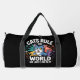 This whimsical graphic features a charming blue and white striped cartoon cat with bright yellow eyes and a happy, open-mouthed expression, sitting contentedly. Behind the feline are bold, abstract shapes in teal, orange, and purple, evoking a sense of dynamic energy. The prominent text in colorful, playful fonts declares, "CATS RULE THE WORLD," followed by the humorous admission, "WE JUST LIVE IN IT." Various stars and paw print accents are scattered around the design, all set against a solid black background. Digital download for personal use only.