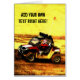 Déchirures audacieuses d'un conducteur de sports automobiles à travers la saleté dans son côte à côte atv de service tous terrains ou utv de SXS. Le rouge et le blanc ont coloré la peinture avec l'assortiment racegear et le casque, sur un arrière - plan jaune et brun. Le style de bande dessinée de gouache a peint l'effet dérivé d'une photographie d'action de sports d'original.