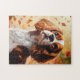 Ein blenheimer Cavalier König Charles Spaniel mit einem weißen und braunen Mantel schaut mit großen, braunen Augen auf. Das Fell des Hundes wird mit einer weichen, realistischen Textur dargestellt. Der Hintergrund ist ein verschwommenes Bild eines Waldes im Herbst mit abfallenden Blätter in Gelb-, Orange- und Rottönen. Die Blätter schaffen ein Gefühl der Bewegung und fügen dem Bild eine Touch von Launen hinzu.