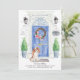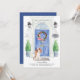 Annoncez votre nouvelle adresse avec notre faire-part élégante avec un Cavalier King Charles Spaniel, porte d'entrée bleue, tapis de bienvenue, ardoise, topiaires et une couronne fleurie posée sur un arrière - plan en brique grise.