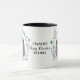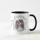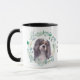 "CAVALIER KING CHARLES SPANIEL" est le texte au centre de cette tasse. Chaque côté de la tasse a un beau portrait d'aquarelle d'un adorable spaniel tricolore dans une couronne de feuilles bleues vertes. Entre les deux images est le texte, qui peut être facilement customisé, ou même supprimé, par vous.
