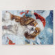Dieses festliche Design spiegelt den fröhlichen Geist der Urlaubssaison wider und besticht durch ein hübsches Jungtier mit einer Weihnachtsmannmütze. Der Hund ist eingebettet in ein winterliches Wunderland, mit einem Schneemann, einem dekorierten Weihnachtsbaum und wunderschön verpackten Geschenken. Schneeflocken fallen sanft ab und geben der Szene eine magische Touch, während die lebhaften Farben der Feriendekorationen eine warme und fröhliche Atmosphäre schaffen.