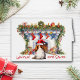 L'avant de cette carte de voeux de Noël a une image d'un petit Cavalier Roi Charles Espagnol brun et blanc portant un chapeau de Père Noël rouge et blanc. Le chien est assis devant une cheminée décorée, attendant le Père Noël. Le texte rouge en bas dit "En attendant Père Noël". Le texte est personnalisable, comme tout le texte intérieur, de sorte que vous pouvez le faire dire ce que vous voulez. Mignonne ! Voir d'autres images d'espagnols, ainsi que des dizaines d'autres produits de races de chiens, à Dog Village.