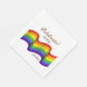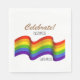 Dieser PRIDE THEMED Napkins verfügt über die LGBTQ-Flagge. Über dem Flag steht der Text "Feiern!" und darunter ein Bereich für benutzerdefinierten Text.