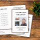 Programme funéraire propre et minimaliste en gris foncé et blanc, avec des polices élégantes. Ajoutez trois photos de votre être aimé avec leur nom et leurs années de vie. Sur le dos vous pouvez écrire la nécrologie et le programme. Pliez-le vous-même pour un programme pratique !