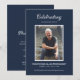 A celebration of life invitation features a photo of your loved one, their name, and details on the front on a navy blue background and the invitation to your celebration on the back. Order PRINTED and or INSTANT DOWNLOAD to send digitally or print yourself. MATCHING items in our collection.