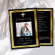 Un programme de funérailles/célébration de la vie élégant, moderne et simple. Un arrière - plan noir classique décoré d'une fausse croix d'or et de cadres faux or. Personnalisez et ajoutez un nom photo et des détails. Texte blanc.