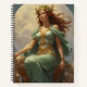 La diosa celestial brilla con luz propia, coronada con hojas y oro y vestida de azul claro, bajo la luminiscencia de la luna llena.