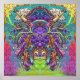 Eine lebendige und komplexe Abbildung, die ein mächtiges, horntes Tier darstellt, umgeben von Drachen, Schwertern und verzierten, dekorativen Elementen. Die Augen des Bestien strahlen Blitze aus, und seine allgemeine Haltung vermittelt ein Gefühl von Autorität und Macht. Eine kleinere, seltsame Kreatur flüchtige Blick von unten heraus und fügt der Szene eine Touch von Launen hinzu. Der Hintergrund ist voll von wirbelnden Wolken und lebhaften Farben.