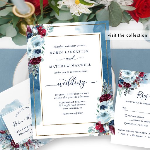 Elegante Hochzeitseinladung mit zarten blauen Aquarellfarben-Flecken, die unterhalb der exquisiten Wasserfarben-Blumenecke liegen und Ihre Hochzeitsdetails umrahmen. Blume und Blätter in harmonischer Kombination aus staubblauen, marinen, bordeauxroten, magentafarbenen, beerischen und lila Farbtönen. Zusammen mit ihren Familien / Eltern oder zusammen mit einer großen Freude Formulierung. Auch verfügbar mit der Ehre Ihrer Anwesenheit Wortlaut statt. Teil unserer Kollektion "Celestial Blooms" mit einer Vielzahl von Produkten zur Koordination.
