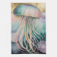 Dieses Kunstwerk besticht durch eine faszinierende Qualle. Die Glocke wird in einem sanften Spektrum an Pastellpinken, Blues und Pfefferminzen mit zarten, leuchtenden Striationen gerendert. Seine langen, fließenden Tentakel verlaufen in einer Kaskade ähnlicher Farben nach unten und schaffen ein Gefühl von anmutiger, welliger Bewegung. Der Hintergrund ist ein traumhafter, abstrakter Raum voller schwebender, orbähnlicher Formen in mutierten Goldtönen, Lavendel und Rosa, was auf eine mystische Unterwasserwelt oder sogar kosmische Umgebung hindeutet. Das Stück verbindet ein Gefühl des biologischen Realismus mit einer surrealen, ätherischen Atmosphäre, die das Wunder und das Geheimnis des Lebens in der Tiefsee weckt.
