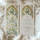 Diese Einladungskarte ist eine atemberaubende Darstellung der islamischen Kunst, die himmlische Goldmedaille, Jadegrün und Elfenbeintönen kombiniert, um ein harmonisches und luxuriöses Ambiente zu schaffen. Die Vorderseite ist mit einem eleganten, islamischen Bogen-Design geschmückt, das mit einem goldenen Filigree und einem üppigen Strauß aus Jade- und Elfenbeinfloralen besticht, die ein Gefühl der Ruhe und Pracht ausstrahlen. Die Rückseite der Karte, die für Ihre Hochzeitsdetails konzipiert ist, spiegelt das vordere Design mit einem subtilen Hintergrund von arabischen Mustern wider. Die durchdachte Kombination von Farbe und verziertem Detail macht dies zu einer perfekten Einführung in eine Hochzeitsfeier, die in kultureller Schönheit und raffiniertem Geschmack verwurzelt ist. Die Gestaltung der Einladungskarte ist in der islamischen künstlerischen Tradition vertieft, die sich durch ihre komplizierten geometrischen Muster, Kalligraphie und detaillierte Blumenmotive auszeichnet. Der Kunststil vermeidet die Darstellung lebender Wesen und konzentriert sich stattdessen auf eine abstrakte, aber zutiefst symbolische Dekoration, die eine spirituelle Bedeutung vermittelt. Die Verwendung von Gold im Design fügt nicht nur eine Touch von Luxus hinzu, sondern hat auch historische Bedeutung in der islamischen Kunst, die oft Licht und göttliche Weisheit repräsentiert. Der Bogen, die Blumenarrangements und die Interwoven-Muster der Einladung sind wunderschön gestaltet, um das Wesen dieses künstlerischen Erbes zu erfassen.