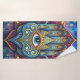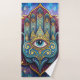 An artistic and detailed representation of the hand of Fatima, a powerful symbol of protection and good fortune, adorned with intricate designs and an all-seeing celestial eye.