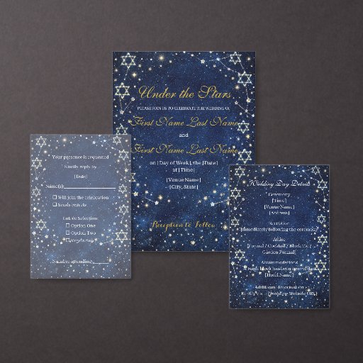 Celebrate your love under a sky full of stars. This celestial wedding invitation features a rich midnight blue background illuminated with delicate golden constellations and subtle Star of David details woven throughout the design. Elegant script and classic serif typography create a romantic balance against the glowing night sky. Perfect for Jewish weddings, evening ceremonies, and couples who want timeless sophistication with a cosmic touch.
