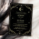 Treten Sie ein in eine Welt der Zauberei mit unserer Celestial Midnight Sky Black Gold Wedding Einladung. Diese luxuriöse Einladung präsentiert ein atemberaubendes goldenes Design vor einem schwarzen Hintergrund, der den Zauber eines Sternenhimmels zum Mitternachtshimmel weckt. Sie ist mit einem Halbmond und glänzenden Sternen verziert und verspricht einen Abend der Eleganz und des himmlischen Wunders, perfekt für Ihre unvergessliche mystische Hochzeit.
