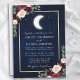 Einladung zur Hochzeit am Himmel. Wasserfarbener Nachthimmel mit Sternen und dem Mond. Burgundy Blue Pink Floral. Eukalyptus-Blätter im Grünen. Goldrahmen.
