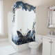 Dieser Duschvorhang ist in den Farben Marineblau und Gold zum himmlischen Stil gehalten. An der oberen und unteren Ebene befindet sich eine Himmelsszene mit Sternen und einem Halbmond. Eine majestätische Motte ist unten abgebildet, Akzente mit Gold und Blumen.